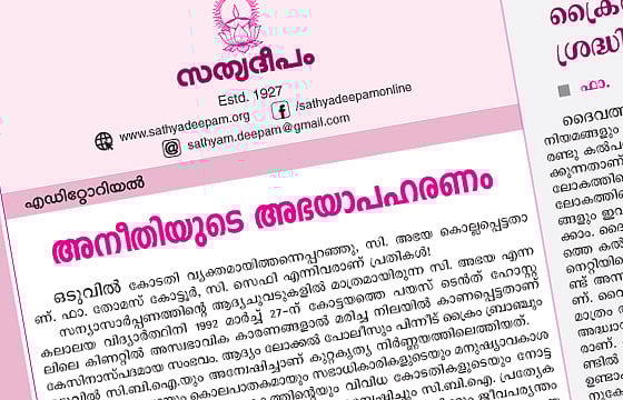 'രാജാവ് നഗ്നനാണ്' എന്നു വിളിച്ചു പറഞ്ഞ ബാലനെ നമ്മള് വീണ്ടും കണ്ടുമുട്ടി; സത്യദീപം ലക്കം 24 ന്റെ മുഖ പ്രസംഗത്തിലൂടെ വെളിവുകെട്ട വെളിപാടിനെക്കുറിച്ച് അതിശക്തമായ ഭാഷയില് പ്രതികരിച്ച സത്യദീപത്തിന് അഭിനന്ദനങ്ങള്. 28 വര്ഷങ്ങള്ക്കപ്പുറം സി. അഭയ കൊല്ലപ്പെട്ടത് തെളിയിക്കപ്പെടാതെ ആര്ക്കോവേണ്ടി സംരക്ഷിക്കപ്പെട്ടിരുന്ന പ്രതികളെ കോടതി ശിക്ഷിച്ചു. മാറിയ കാലത്തെ ചിന്തകള് ശിക്ഷിക്കപ്പെട്ട പ്രതികളുടെ സമൂഹത്തെയും, സംശയത്തിന്റെ നിഴലിലാക്കി. അന്നത്തെ രൂപതാ നേതൃത്വം ആരെയോ സംരക്ഷിക്കാന് എടുത്ത തീരുമാനം മൂലം ഒന്നിലധികം തലമുറകള്ക്ക് മുമ്പില് സി. അഭയയുടെ കൊലപാതകവും, അനുബന്ധ സംഭവങ്ങളും പോസ്റ്റ്മോര്ട്ടം ചെയ്യപ്പെട്ടു. 'മലര്ന്നു കിടന്നു തുപ്പി സ്വയം തുടച്ചു കളയുന്നവരെ'ക്കുറിച്ച് എഡിറ്റോറിയല് ഗംഭീരമാക്കിയിരിക്കുന്നു.