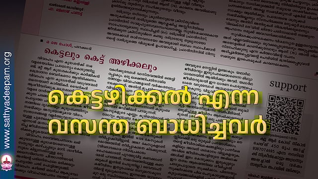 ഒ.ജെ. പോള് പാറകടവിന്റെ സത്യദീപം ലക്കം 11-ല് 'കെട്ടലും അഴിക്കലും' എന്ന പ്രതികരണത്തില്, ഒരു വര്ഷം സംഭവിക്കുന്ന, വിവാഹമോചനങ്ങളുടെ, വക്കീല് നോട്ടീസയച്ച് വേര്പെട്ട് നില്ക്കുന്നവരുടെ, സംഖ്യകള് വായിച്ചപ്പം അമ്പരന്ന് പോയി. ഇവരുടെ മനസ്സാക്ഷി എന്താണ് ഇവരോട് ചോദിക്കുന്നത്? മക്കള് നല്ല വിവാഹജീവിതം നയിക്കുന്നത് കാണുക എന്ന മാതാപിതാക്കളുടെ മോഹവും, തകര്ന്നടിയുന്നത് അതിദയനീയമാണ്.
