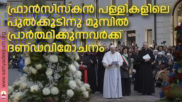 പ. മറിയത്തിന്റെ അമലോത്ഭവത്തിരുനാളായ ഡിസംബര് 8 മുതല് ഉണ്ണീശോയുടെ കാഴ്ചവയ്പ് തിരുനാളായ ഫെബ്രുവരി രണ്ടു വരെയുള്ള ദിവസങ്ങളില് ഏതെങ്കിലും ഫ്രാന്സിസ്കന് പള്ളിയിലെ പുല്ക്കൂടിനു മുമ്പില് പ്രാര്ത്ഥിക്കുന്നവര്ക്കു ഫ്രാന്സിസ് മാര്പാപ്പ ദണ്ഡവിമോചനം പ്രഖ്യാപിച്ചു. വി. ഫ്രാന്സിസിന്റെ സന്യാസനിയമങ്ങള് സഭ അംഗീകരിച്ചു നല്കിയതിന്റെയും വിശുദ്ധന് ആദ്യമായി പുല്ക്കൂട് നിര്മ്മിച്ച് ക്രിസ്മസ് ആഘോഷിച്ചതിന്റെയും എണ്ണൂറാം വാര്ഷികമാണിത്. ഇതോടനുബന്ധിച്ചാണ് ഈ ദണ്ഡവിമോചനം പ്രഖ്യാപിച്ചിട്ടുള്ളത്. ഫ്രാന്സിസ്കന് സന്യാസസമൂഹങ്ങളോ സംഘടനകളോ നടത്തുന്ന പള്ളികളില് ഒരുക്കിയിട്ടുള്ള പുല്ക്കൂടുകള്ക്കു മുമ്പില് പ്രാര്ത്ഥിക്കുന്നവര്ക്ക് ദണ്ഡവിമോചനം പ്രഖ്യാപിക്കണമെന്ന അഭ്യര്ത്ഥന അപ്പസ്തോലിക് പെനിറ്റെന്ഷ്യറി അംഗീകരിക്കുകയായിരുന്നു. ഉപാധികള്ക്കു വിധേയമായി ലഘുപാപങ്ങളില് നിന്നു മോചനം നല്കുന്നതാണ് ദണ്ഡവിമോചനം. കുമ്പസാരിച്ചു വി.കുര്ബ്ബാന സ്വീകരിച്ചിരിക്കുക, പാപ്പായുടെ നിയോഗങ്ങള്ക്കു വേണ്ടി പ്രാര്ത്ഥിക്കുക തുടങ്ങിയവയാണ് ഉപാധികള്.