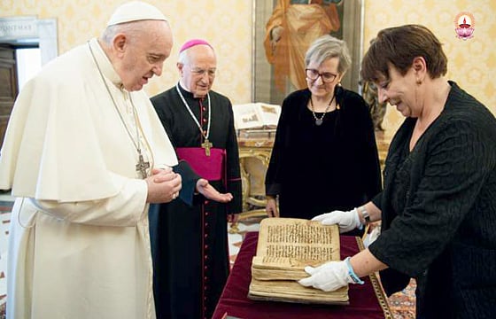 ഇറാഖില്, ഇസ്ലാമിക് സ്റ്റേറ്റ് ഭീകരവാദികളില് നിന്നു വീണ്ടെടുത്ത അറമായ ഭാഷയിലുള്ള പുരാതനവും കൈയെഴുത്തു രൂപത്തിലുള്ളതുമായ ഒരു ക്രൈസ്തവ പ്രാര്ത്ഥനാ പുസ്തകം ഫ്രാന്സിസ് മാര്പാപ്പയ്ക്കു സമ്മാനിച്ചു. 14, 15 നൂറ്റാണ്ടുകള്ക്കിടയില് എഴുതപ്പെട്ട ഈ ഗ്രന്ഥം സുറിയാനി പാരമ്പര്യത്തിലെ ഉയിര്പ്പുകാലത്തെ ആരാധനാക്രമ പ്രാര്ത്ഥനകളുടേതാണ്.