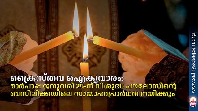 വിശുദ്ധ പൗലോസിന്റെ മാനസാന്തരത്തിരുനാള് ആഘോഷിക്കപ്പെടുന്ന ജനുവരി 25-ന് വൈകുന്നേരം അഞ്ചരയ്ക്കായിരിക്കും വിശുദ്ധ പൗലോസിന്റെ ബസിലിക്കയില്, ക്രൈസ്തവ ഐക്യവാരത്തിന്റെ സമാപനം കുറിച്ചുകൊണ്ടുള്ള സായാഹ്നപ്രാര്ഥന പരിശുദ്ധ പിതാവ് നയിക്കുക. ജനുവരി 19 മുതല് രണ്ടു ദേവാലയങ്ങളില് ക്രൈസ്തവ ഐക്യവാരവുമായി ബന്ധപ്പെട്ട പ്രാര്ഥനകള് നടന്നുവരുന്നുണ്ട്.