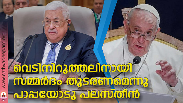 പലസ്തീന് പ്രസിഡന്റ് മുഹമ്മദ് അബ്ബാസ്, ഫ്രാന്സിസ് മാര്പാപ്പയുമായി ഫോണില് സംസാരിച്ചു. ഇസ്രായേല്-പലസ്തീന് യുദ്ധത്തില് വെടിനിറുത്തലിനായി മാര്പാപ്പ നടത്തിക്കൊണ്ടിരിക്കുന്ന സമ്മര്ദ്ദങ്ങളും നയതന്ത്രശ്രമങ്ങളും തുടരണമെന്നു അബ്ബാസ് മാര്പാപ്പയോട് ആവശ്യപ്പെട്ടതായി പലസ്തീനിയന് വാര്ത്താ ഏജന്സി പറഞ്ഞിരുന്നു. മാര്പാപ്പ നടത്തുന്ന സമാധാനശ്രമങ്ങള്ക്ക് പലസ്തീനിയന് പ്രസിഡന്റ് നന്ദി പറഞ്ഞു. ഗാസയിലെ കത്തോലിക്കാ ഇടവകവികാരിയുമായി മാര്പാപ്പ നിരന്തരമായ ബന്ധം സൂക്ഷിക്കുന്നുണ്ടെന്ന് വത്തിക്കാന് നേരത്തെ അറിയിച്ചിരുന്നു. ജറുസലേമിനു പ്രത്യേക പദവി നല്കുന്ന ദ്വിരാഷ്ട്രപരിഹാരമാണ് ഇസ്രായേല്-പലസ്തീന് സമാധാനസ്ഥാപനത്തിനാവശ്യമെന്നു മാര്പാപ്പ നേരത്തെ വ്യക്തമാക്കിയിട്ടുള്ളതാണ്.