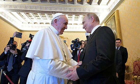 റഷ്യന് പ്രസിഡന്റ് വ്ളാദിമിര് പുടിന് ഫ്രാന്സിസ് മാര്പാപ്പയെ സന്ദര്ശിച്ചു. ഇരുവരുടേയും സ്വകാര്യകൂടിക്കാഴ്ച 55 മിനിറ്റ് ദീര്ഘിച്ചു. സിറിയ, ഉക്രെയിന്, വെനിസ്വേലാ എന്നീ രാജ്യങ്ങളിലെ പ്രശ്നങ്ങള് സംഭാഷണവിഷയമായതായി വത്തിക്കാന് പത്രക്കുറിപ്പില് അറിയിച്ചു. പാരിസ്ഥിതിക പ്രശ്നങ്ങള്, റഷ്യയിലെ കത്തോലിക്കാസഭയെ സംബന്ധിക്കുന്ന കാര്യങ്ങള് എന്നിവയും സംസാരിച്ചു. തനിക്കു വേണ്ടി ഇത്രയും സമയം അനുവദിച്ചതിനു പുടിന് മാര്പാപ്പയ്ക്കു നന്ദി പറഞ്ഞു. ഇതുവരെ 5 തവണ വത്തിക്കാന് സന്ദര്ശിച്ചിട്ടുള്ള റഷ്യന് പ്രസിഡന്റ് ഫ്രാന്സിസ് മാര്പാപ്പയെ കാണുന്നത് ഇതു മൂന്നാം പ്രാവശ്യമാണ്. 2000-ല് ജോണ് പോള് രണ്ടാമന് മാര്പാപ്പയേയും 2007-ല് ബെനഡിക്ട് പതിനാറാമന് മാര്പാപ്പയേയും പുടിന് സന്ദര്ശിച്ചിട്ടുണ്ട്. 2009-ലാണു റഷ്യയും വത്തിക്കാനും തമ്മില് പൂര്ണതോതിലുള്ള നയതന്ത്രബന്ധം നിലവില് വന്നത്.