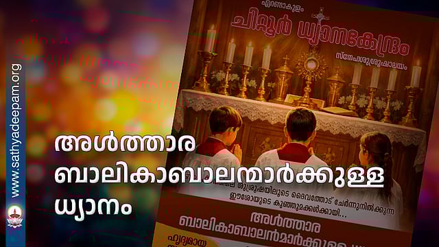 ബലിപീഠത്തിലെ ശുശ്രൂഷയിലൂടെ ദൈവത്തോട് ചേർന്നുനിൽക്കുന്ന ഈശോയുടെ കുഞ്ഞുമക്കളായ അൾത്താര ബാലികാബാലന്മാർക്കായി എറണാകുളം ചിറ്റൂർ ധ്യാനകേന്ദ്രത്തിൽ വെച്ച് നടത്തപ്പെടുന്ന ധ്യാനത്തിലേക്ക് ഒത്തിരി സ്നേഹത്തോടെ സ്വാഗതം ചെയ്യുന്നു.
