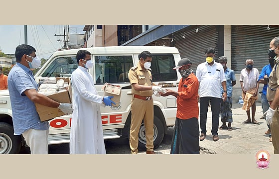 ചിത്രം : സിറ്റി പോലീസിന്റെ സഹകരണത്തോടെ സഹൃദയ ഭക്ഷണപ്പൊതികൾ കൊച്ചി സെൻട്രൽ പോലീസ് കമ്മീഷണർ എ. ജെ തോമസ് വിതരണം ചെയ്യുന്നു. സഹൃദയ ഡയറക്ടർ ഫാ. ജോസഫ് കൊളുത്തുവെള്ളിൽ, അസിസ്റ്റന്റ് ഡയറക്ടർ ഫാ. ആൻസിൽ മയ്പ്പാൻ, പി. ആർ. ഓ ജോസഫ് കുരുവിള എന്നിവർ സമീപം.