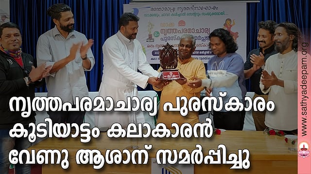 കൊച്ചി : ഡാന്സേഴ്സ് ആന്റ് കൊറിയോഗ്രാഫേഴ്സ് അസോസിയേഷന്റെ (ഡാക്ക) നൃത്ത പരമാചാര്യ പുരസ്കാരം കേരളത്തിലെ കൂടിയാട്ടം കലയുടെ കുലപതി വേണു ആശാന് (വേണുജി) ചാവറ കള്ച്ചറല് സെന്റര് ഡയറക്ടര് ഫാ. തോമസ് പുതുശ്ശേരി സമര്പ്പിച്ചു. അന്താരാഷ്ട്ര നൃത്ത ദിനത്തില് കൊച്ചി ചാവറ കള്ച്ചറല് സെന്ററില് നടന്ന പുരസ്കാര സമര്പ്പണ ചടങ്ങ് മലയാളത്തിന്റെ പവര് സിംഗര് വിബിന് സേവ്യര് ഉദ്ഘാടനം ചെയ്തു.