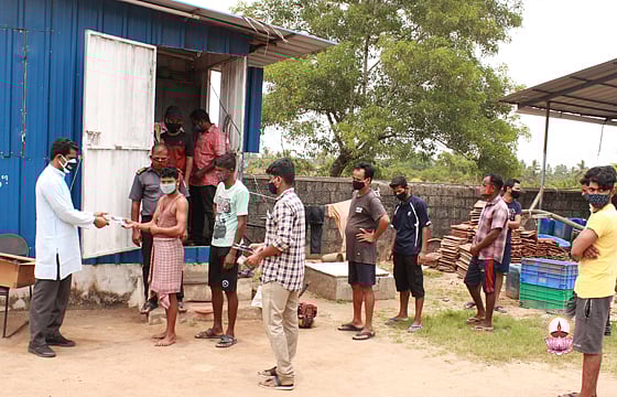 ഫോട്ടോ: മരട് ലേബർ ക്യാമ്പിലെ അതിഥി തൊഴിലാളികൾക്ക് സഹൃദയയുടെ നേതൃത്വത്തിൽ സൗജന്യമായി മാസ്കുകൾ വിതരണം ചെയ്യുന്നു.