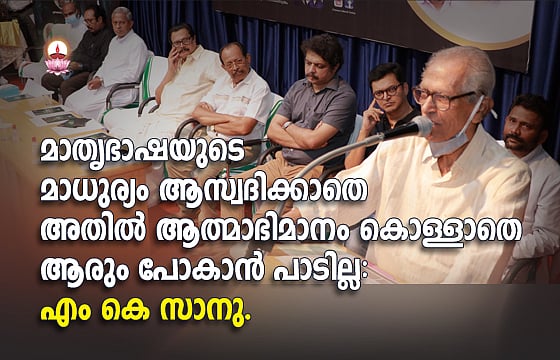 മാതൃഭാഷയുടെ മാധുര്യം ആസ്വദിക്കാതെ അതിൽ ആത്മാഭിമാനം കൊള്ളാതെ ആരും പോകാൻ പാടില്ലെന്ന് എം.കെ. സാനു അഭിപ്രായപ്പെട്ടു. ചാവറ കൾച്ചറൽ സെൻറർ സംഘടിപ്പിച്ച മലയാള ഭാഷാവാരാചരണ സമാപന സമ്മേളനവും സുവർണ്ണ ചാവറ ചലച്ചിത്ര പുരസ്കാര ചടങ്ങും ഉദ്ഘാടനം ചെയ്ത് സംസാരിക്കുകയായിരുന്നു അദ്ദേഹം.