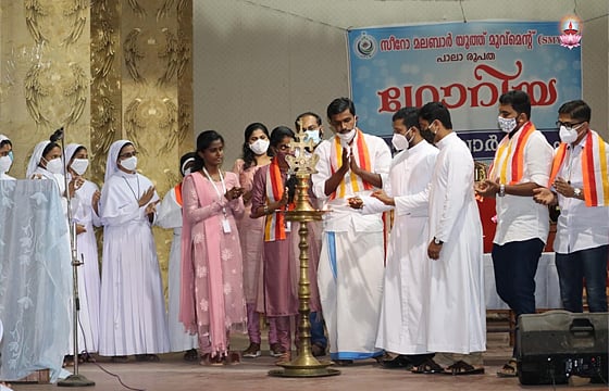 ഫോട്ടോ അടിക്കുറിപ്പ്: എസ് എം വൈ എം പാലാ രൂപത വാർഷികം ഫാ. ജെയിംസ് ചൊവ്വേലികുടിയിൽ, ഫാ. എബിൻ കുന്നത്ത് സി എം ഐ എന്നിവർ സംയുക്തമായി നിർവഹിക്കുന്നു. രൂപത ഭാരവാഹികൾ, നവ സന്യാസിനികൾ, യുവദമ്പതികൾ, ആനിമേറ്റർ സി. മേരിലിറ്റ് എഫ് സി സി തുടങ്ങിയവർ സമീപം.