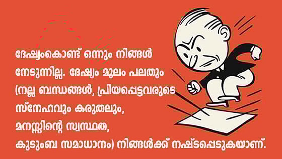 എന്തായാലും ദേഷ്യപ്പെടുന്നവര് അറിഞ്ഞിരിക്കേണ്ട ഒന്ന്, ദേഷ്യംകൊണ്ട് ഒന്നും നിങ്ങള് നേടുന്നില്ല എന്നതാണ്. ദേഷ്യം മൂലം പലതും (നല്ല ബന്ധങ്ങള്, പ്രിയപ്പെട്ടവരുടെ സ്നേഹവും കരുതലും, മനസ്സിന്റെ സ്വസ്ഥത, കുടുംബസമാധാനം) നിങ്ങള്ക്ക് നഷ്ടപ്പെടുകയാണ് താനും.