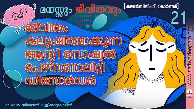 ആന്സി മനഃശാസ്ത്രജ്ഞനെ സമീപിച്ചത് 'എന്റെ ജീവിതം തകര്ന്നു' എന്ന് ഉറക്കെ പറഞ്ഞുകൊണ്ടാണ്. അവളുടെ കൈയില് ഒരു ദിനപത്രവുമുണ്ട്. അതില്, അവളുടെ ഭര്ത്താവായ മനുവിന്റെ ഫോട്ടോയാണ് കാണുന്നത്. സര്ട്ടിഫിക്കറ്റുകള്, വ്യാജമായി സൃഷ്ടിച്ച് ധനസഹായ സ്ഥാപനങ്ങളില് നിന്നും പണം തട്ടിയെടുക്കലാണ് മനുവിന്റെ പതിവ്. ഒരു തവണയല്ല പല തവണ ഇത് ആവര്ത്തിച്ചു. മനുവിന് ധാരാളം സുഹൃത്തുക്കളുണ്ട്, പണം ലഭിക്കുമ്പോള് അവരുമായി മദ്യവും ലഹരിവസ്തുക്കളും മറ്റുമായി കുറെ നാള് ആര്ഭാടമായി ജീവിക്കും. ഭര്ത്താവിനോട് ഇതേപറ്റി പറഞ്ഞാല് കോപിക്കുകയും, ഉപദ്രവിക്കുകയും ചെയ്യും. ഇത് മൂന്നാമത്തെ തവണയാണ് പൊലീസ് പിടിച്ച് ജയിലിലാക്കി, ജാമ്യത്തിലിറങ്ങുന്നത് ഇവിടെ 'ആന്റി സോഷ്യല് പേഴ്സണാലിറ്റി ഡിസോര്ഡറാണ്' ആന്സിയുടെ ഭര്ത്താവില് കാണുന്നത്.