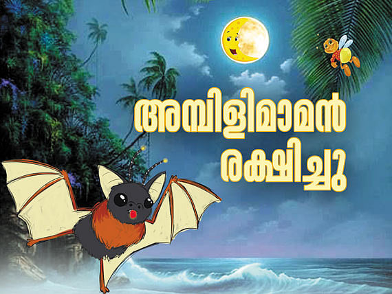 അയ്യോ, ആ കുഞ്ഞു മിന്നാമിന്നിയെ രക്ഷിക്കണമല്ലോ. അല്ലെങ്കില് പാവത്തിനെ വവ്വാല് വിഴുങ്ങും; മാനത്തു തെളിഞ്ഞു നിന്ന അമ്പിളിമാമനു സങ്കടമായി. അദ്ദേഹത്തിന് ഒരു ബുദ്ധി തോന്നി. അമ്പിളിമാമന് വേഗം ഒരു നക്ഷത്രപ്പൂവ് പറിച്ചെടുത്തു ജിമ്പന് വവ്വാലിന്റെ മുഖത്തേയ്ക്കിട്ടു. നക്ഷത്രപ്പൂവ് ജിമ്പന്റെ മുഖത്തുതന്നെ വന്നുവീണു.