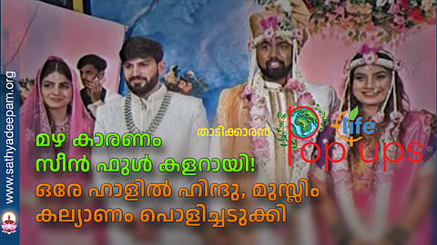 സീന് കണ്ടപ്പോള് മുസ്ലിം കപ്പിളിന്റെ വീട്ടുകാര് ഒട്ടും മടിച്ചില്ല. അവര് മറ്റൊന്നും നോക്കാതെ തങ്ങളുടെ കല്യാണഹാള് മറ്റവര്ക്ക് കൂടി ഷെയര് ചെയ്യാന് കൊടുത്തു. അങ്ങനെ ഒരേ പന്തലില്, ഒരേ സമയം രണ്ട് അടിപൊളി കല്യാണങ്ങള് നടന്നു.