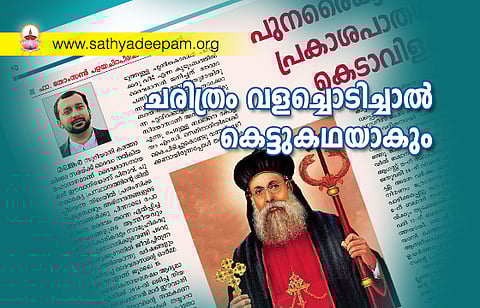 അതേ ലക്കത്തില് തന്നെ ജര്മ്മനിയില് നിന്നുള്ള ഫാദര് തോംസണ് പഴയചിറപീടികയില് മാര് ഇവാനിയോസിനെക്കുറി ച്ച് എഴുതുന്നുണ്ട്. പുനരൈക്യ പ്രസ്ഥാനത്തിന്റെ ശില്പി എന്നും മറ്റും പറഞ്ഞു കൊണ്ടാണ് അദ്ദേഹം ആരംഭിക്കുന്നത്. 1930-ല് ആണ് മാര് ഇവാനിയോസ് പുനരൈക്യപ്പെ ടുന്നത്. ശരി തന്നെ. 1921-ല് തന്നെ പുനരൈക്യം ആരംഭിച്ചു എന്ന ചരിത്രം അദ്ദേഹം വിട്ടുകളഞ്ഞിരിക്കുന്നു. കൂനന് കുരിശ് സത്യം ചെയ്തു വിഭജിച്ചുപോയവരിലെ തെക്കുംഭാഗ (ക്നാനായ) സമൂഹത്തെ കത്തോലിക്കാ സഭയിലേക്ക് തിരികെ കൊണ്ടുവരുന്നതിനാണ് കോട്ടയം വികാരിയാത്തി ലെ മെത്രാന്മാര് പുനരൈക്യ പ്രസ്ഥാനം ആരംഭിച്ചത്. മാര് മാക്കീല് തുടങ്ങി വച്ച പരിശ്രമം അലക്സാണ്ടര് ചൂളപ്പറമ്പില് യാഥാര്ത്ഥ്യമാക്കി. പുനരൈക്യപ്പെടുവാന് തയ്യാറായി വന്നവ രുടെ ഒരേ ഒരു ആവശ്യം അവര് ഇപ്പോള് ഉപയോഗി ച്ചു കൊണ്ടിരിക്കുന്ന അന്ത്യോക്യന് ആരാധനക്രമം തുടരുവാന് അനുവദിക്കണമെന്ന് മാത്രമായിരുന്നു. മാര് ചൂളപ്പറമ്പില് മുന് കൈയെടുത്ത് മറ്റു സുറിയാനി മെത്രാന്മാരെയും കൂട്ടി മാര്പാപ്പയ്ക്ക് അപേക്ഷ കൊടുത്ത് അന്ത്യോക്യന് ആരാധന ക്രമം തുടരാന് അനുവദിപ്പിച്ചു. അതിനു ശേഷം 1921-ല് ആദ്യത്തെ പുനരൈക്യം കോട്ടയം വികാരിയാത്തില് നടന്നു. തുടര്ന്ന് മാര് ഇവാനിയോസ് തന്റെ കൂടെ കുറെ പേരും ആയി 1930-ല് കത്തോലിക്കാ സഭയെ ആശ്ലേഷിച്ചു. തുടര്ന്ന് കൂട്ടം കൂട്ടമായി ആളുകള് കത്തോലിക്കാസഭയിലക്ക് കടന്നുവരികയായിരുന്നു. ചരിത്രം ഇങ്ങനെ കൃത്യമായി രേഖപ്പെടുത്തിവച്ചിരിക്കുന്നു. എന്തുകൊണ്ട് ഇത്തരം ചരിത്രത്തെ തമ സ്കരിക്കുന്നു എന്ന് ചര്ച്ച ചെയ്യേണ്ടിയിരിക്കുന്നു. ചരിത്രം വളച്ചൊടിച്ചാല് അത് കെട്ടുകഥയാകാന് അധികകാലം വേണ്ടിവരില്ല. സത്യദീപം ഇതിനു കൂട്ടുനില്ക്കരുത്.