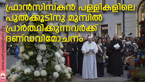 പ. മറിയത്തിന്റെ അമലോത്ഭവത്തിരുനാളായ ഡിസംബര് 8 മുതല് ഉണ്ണീശോയുടെ കാഴ്ചവയ്പ് തിരുനാളായ ഫെബ്രുവരി രണ്ടു വരെയുള്ള ദിവസങ്ങളില് ഏതെങ്കിലും ഫ്രാന്സിസ്കന് പള്ളിയിലെ പുല്ക്കൂടിനു മുമ്പില് പ്രാര്ത്ഥിക്കുന്നവര്ക്കു ഫ്രാന്സിസ് മാര്പാപ്പ ദണ്ഡവിമോചനം പ്രഖ്യാപിച്ചു. വി. ഫ്രാന്സിസിന്റെ സന്യാസനിയമങ്ങള് സഭ അംഗീകരിച്ചു നല്കിയതിന്റെയും വിശുദ്ധന് ആദ്യമായി പുല്ക്കൂട് നിര്മ്മിച്ച് ക്രിസ്മസ് ആഘോഷിച്ചതിന്റെയും എണ്ണൂറാം വാര്ഷികമാണിത്. ഇതോടനുബന്ധിച്ചാണ് ഈ ദണ്ഡവിമോചനം പ്രഖ്യാപിച്ചിട്ടുള്ളത്. ഫ്രാന്സിസ്കന് സന്യാസസമൂഹങ്ങളോ സംഘടനകളോ നടത്തുന്ന പള്ളികളില് ഒരുക്കിയിട്ടുള്ള പുല്ക്കൂടുകള്ക്കു മുമ്പില് പ്രാര്ത്ഥിക്കുന്നവര്ക്ക് ദണ്ഡവിമോചനം പ്രഖ്യാപിക്കണമെന്ന അഭ്യര്ത്ഥന അപ്പസ്തോലിക് പെനിറ്റെന്ഷ്യറി അംഗീകരിക്കുകയായിരുന്നു. ഉപാധികള്ക്കു വിധേയമായി ലഘുപാപങ്ങളില് നിന്നു മോചനം നല്കുന്നതാണ് ദണ്ഡവിമോചനം. കുമ്പസാരിച്ചു വി.കുര്ബ്ബാന സ്വീകരിച്ചിരിക്കുക, പാപ്പായുടെ നിയോഗങ്ങള്ക്കു വേണ്ടി പ്രാര്ത്ഥിക്കുക തുടങ്ങിയവയാണ് ഉപാധികള്.