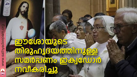 ഈശോയുടെ തിരുഹൃദയത്തിന് രാജ്യത്തെ സമര്പ്പിച്ചതിന്റെ നവീകരണം വിശുദ്ധ വാരത്തിലെ തിങ്കളാഴ്ച ക്വിറ്റോ അതിരൂപതയുടെ ആര്ച്ചുബിഷപ് നിര്വഹിച്ചു. കഴിഞ്ഞ 150 വര്ഷമായി ഇക്വഡോറില് നടന്നുവരുന്ന പതിവാണിത്. സഭാധികാരികള്ക്ക് പുറമെ സിവില് അധികാരികളും ചടങ്ങില് സംബന്ധിച്ചു. 1874-ല് അന്നത്തെ പ്രസിഡന്റിന്റെ നിര്ദേശപ്രകാരമായിരുന്നു രാജ്യത്തെ തിരുഹൃദയത്തിന് സമര്പ്പിച്ചത്. അതോടെ തിരുഹൃദയത്തിന് സമര്പ്പിക്കപ്പെടുന്ന ആദ്യരാജ്യമായും ഇക്വഡോര് മാറി. ഈ വര്ഷം അന്താരാഷ്ട്ര ദിവ്യകാരുണ്യ കോണ്ഗ്രസിനും വേദിയാവുകയാണ് ഇക്വഡോര്. സെപ്റ്റംബര് 8 മുതല് 15 വരെയാണ് ക്വിറ്റോയില് ദിവ്യകാരുണ്യ കോണ്ഗ്രസ് നടക്കുക. 'ലോകസൗഖ്യത്തിന് സാഹോദര്യം' എന്ന പ്രമേയവുമായി നടക്കുന്ന ദിവ്യകാരുണ്യ കോണ്ഗ്രസില് ഫ്രാന്സിസ് മാര്പാപ്പ പങ്കെടുക്കുമെന്നും പ്രതീക്ഷിക്കപ്പെടുന്നുണ്ട്.