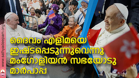 ചെറിയ സംഖ്യ കൊണ്ട് വലിയ കാര്യങ്ങള് നേടാന് ദൈവത്തിനു കഴിയുമെന്നു മംഗോളിയായിലെ കത്തോലിക്കാസഭയോടു ഫ്രാന്സിസ് മാര്പാപ്പ. ചെറുതായിരിക്കുന്നത് ഒരു പ്രശ്നമല്ലെന്നും മാര്പാപ്പ പറഞ്ഞു. ലോകത്തിലെ ഏറ്റവും ചെറിയ കത്തോലിക്കാസമൂഹമാണ് മംഗോളിയായിലേത്. ദൈവം എളിമയെ ഇഷ്ടപ്പെടുന്നു. എളിമയിലൂടെ ദൈവം വലിയ കാര്യങ്ങള് നേടുന്നുവെന്നു പരി. മറിയം തന്നെ സാക്ഷ്യപ്പെടുത്തുന്നു. അതുകൊണ്ട് എണ്ണത്തെയോ വിജയങ്ങളുടെ പരിമിതികളെയോ പ്രസക്തിയില്ലായ്മയെ യോ കുറിച്ച് ആകുലരാകേണ്ടതില്ല. ദൈവം പ്രവര്ത്തിക്കുന്നത് അങ്ങനെയൊക്കെയാണ്. പരി. മറിയത്തില് ദൃഷ്ടിയുറപ്പിച്ചു നീങ്ങുക. അവളുടെ എളിമ ആകാശങ്ങളേക്കാള് വലിപ്പമുള്ളതാണ് - മാര്പാപ്പ വിശദീകരിച്ചു. പ്രാര്ത്ഥനയുടെ പ്രാധാന്യം മംഗോളിയന് സഭയെ മാര്പാപ്പ ഓര്മ്മിപ്പിച്ചു.