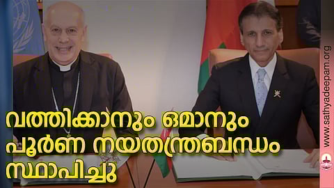 ഗള്ഫിലെ മുസ്ലീം രാഷ്ട്രമായ ഒമാനുമായി വത്തിക്കാന് പൂര്ണ നയതന്ത്രബന്ധം സ്ഥാപിച്ചു. ഇതോടെ ലോകത്തില് വത്തിക്കാനുമായി നയതന്ത്രബന്ധമില്ലാത്ത രാഷ്ട്രങ്ങളുടെ എണ്ണം ആറായി ചുരുങ്ങി. യു എന്നിലെ വത്തിക്കാന് പ്രതിനിധി ആര്ച്ചുബിഷപ് ഗബ്രിയേലെ കാച്ചിയായും ഒമാന് പ്രതിനിധി ഡോ. മൊഹമ്മദ് അല് ഹസ്സനുമാണ് ന്യൂയോര്ക്കിലെ ഒമാന് ആസ്ഥാനത്ത് ഇതു സംബന്ധിച്ച രേഖകളില് ഒപ്പു വച്ചത്. പരസ്പരധാരണ വളര്ത്താനും സൗഹൃദവും സഹകരണവും ശക്തമാക്കാനും ഈ നടപടി സഹായകരമാകുമെന്നു ഇരുരാജ്യങ്ങളും സംയുക്തമായി പുറപ്പെടുവിച്ച പ്രസ്താവന പ്രത്യാശിക്കുന്നു. ഒമാനില് വത്തിക്കാന്റെ സ്ഥാനപതി കാര്യാലയം സ്ഥാപിതമാകും. ഒമാനില് നാല് കത്തോലിക്കാ ഇടവകകളും ഒരു ഡസനോളം വൈദികരും ഉണ്ട്.