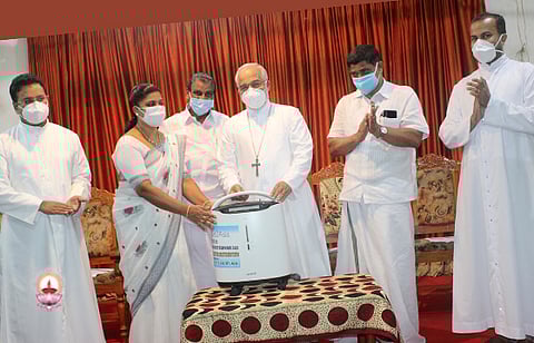 ഫോട്ടോ അടിക്കുറിപ്പ്: കോട്ടയം സോഷ്യല് സര്വ്വീസ് സൊസൈറ്റിയുടെ നേതൃത്വത്തില് കോട്ടയം മുനിസിപ്പാലിറ്റിയ്ക്ക് ലഭ്യമാക്കുന്ന ഓക്സിജന് കോണ്സന്ട്രേറ്റര് കോട്ടയം അതിരൂപത മെത്രാപ്പോലിത്ത മാര് മാത്യു മൂലക്കാട്ടില് നിന്നും കോട്ടയം മുനിസിപ്പല് ചെയര്പേഴ്സണ് ബിന്സി സെബാസ്റ്റ്യന് ഏറ്റുവാങ്ങുന്നു, ഫാ. സുനില് പെരുമാനൂര്, തിരുവഞ്ചൂര് രാധാകൃഷ്ണന് എം.എല്.എ, റ്റി.സി റോയി, ഫാ. മാത്യുസ് വലിയപുത്തന്പുരയില് എന്നിവര് സമീപം.