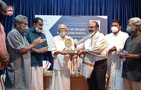 മരുഭൂമിയിലെ നീര്മര പ്രദേശംപോലെയാണ് ഡി.ബി. ബിനുവെന്ന് പ്രൊഫ. എം.കെ. സാനു അഭിപ്രായപ്പെട്ടു. ചാവറ കള്ച്ചറല് സെന്ററും ആര്.ടി.ഐ. കേരള ഫെഡറേഷന് സംയുക്തമായി ഉപഭോക്തൃ തര്ക്ക പരിഹാര കമ്മീഷന് എറണാകുളം ജില്ലാ പ്രസിഡന്റായി നിയമിതനായ ശ്രീ. ഡി.ബി. ബിനുവിന് അനുമോദിക്കുന്നതിനായുള്ള യോഗം ഉദ്ഘാടനം ചെയ്തു സംസാരിക്കുകയായിരുന്നു അദ്ദേഹം. ബിനുവിന്റെ ഉത്തരവുകള് സമൂഹത്തിനും പൊതുനന്മയ്ക്കുമായി മാറുമെന്നത് ഒരു മാസം കൊണ്ടുതന്നെ അദ്ദേഹം നല്കിയ ഉത്തരവുകളില് പ്രകടമാണെന്നും ഇനിയും കൂടുതല് ജീവിക്കണമെന്ന ആഗ്രഹം ഇതുമൂലം എന്നില് ജനിപ്പിക്കുന്നുവെന്നും മുഖ്യപ്രഭാഷണം നടത്തിയ ജസ്റ്റിസ് എം.ആര്. ഹരിഹരന് നായര് അഭിപ്രായപ്പെട്ടു. കാരണം അടുത്ത മൂന്നുവര്ഷക്കാലം പ്രകടമായ മാറ്റങ്ങള് ഉള്ക്കൊള്ളാവുന്ന തരത്തിലുള്ള നീതിബോധവും അര്പ്പണമനോഭാവവും വിനയാന്വിതയും ഡി. ബി. ബിനുവില് പ്രകടമാണെന്നും ആശംസയോടെ അദ്ദേഹം പറഞ്ഞു. ആര്.ടി. ഐ. കേരള ഫെഡറേഷന് സംസ്ഥാന പ്രസിഡന്റ് ശശികുമാര് മാവേലിക്കര അദ്ധ്യക്ഷത വഹിച്ചു. സാനു മാഷ് ഡി.ബി. ബിനുവിനെ പൊന്നാട അണിയിച്ചു. ചാവറ കള്ച്ചറല് സെന്റര് ഡയറക്ടര് ഫാ. തോമസ് പുതുശ്ശേരി സി.എം.ഐ., കെ.എന്.കെ. നമ്പൂതിരി, ഫാ. അനില് ഫിലിപ്പ് , അഡ്വ. എ. ജയകുമാര്, കെ. എ. ഇല്ല്യാസ്, മോഹനചന്ദ്രന് എന്നിവര് പ്രസംഗിച്ചു.
