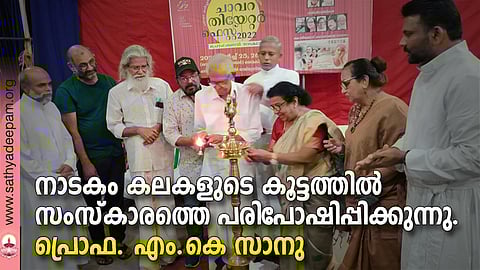 നാടകരംഗം അപചയം നേരിടുന്ന കാലഘട്ടത്തിലാണ് ചാവറ കള്ച്ചറല് സെന്റര് നാടകമേള നടത്തുന്നതെന്നത് ശുഭോതര്ക്കമാണ്. കോവിഡ് കാലഘട്ടത്തില് ഏറ്റവുമധികം ബുദ്ധിമുട്ടനുഭവിച്ച കലാകാരന്മാരെ പ്രോത്സാഹിപ്പിക്കുന്നതിനായാണു നാടക മേള നടത്തുന്നത്. ഫാ. മാര്ട്ടിന് മള്ളാത്ത് അധ്യക്ഷത വഹിച്ചു. കെ പി എ സി ബിയാട്രിസ്, സതീഷ് സംഘമിത്ര, ആര്ട്ടിസ്റ് സുജാതന് എന്നിവരെ ആദരിച്ചു. രമേശ് വര്മ്മ, ഷേര്ളി സോമസുന്ദരം, ഫാ. മാര്ട്ടിന് മള്ളാത്ത്, ഫാ. തോമസ് പുതുശ്ശേരി, ഫാ. അനില് ഫിലിപ്പ്, ജോളി പവേലില് എന്നിവര് പ്രസംഗിച്ചു.
