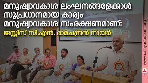 എന്നാല് അതിനനുസരിച്ച വികസന പ്രവര്ത്തനങ്ങള് ഇവിടെ നടക്കുന്നുണ്ടോ? അതൊരു മനുഷ്യാവകാശ ലംഘനം തന്നെ. സൗജന്യ ഗ്യാസ്, ഇലക്ട്രിസിറ്റി എന്നിവ പൗരന്റെ അവകാശങ്ങളാണ് അവയും സംരക്ഷിക്കപ്പെടണം. മനുഷ്യാവകാശ പ്രവര്ത്തകര്ക്ക് ഇവിടെ ചെയ്യുവാന് ഒരുപാട് കാര്യങ്ങള് ഉണ്ട്. സ്വകാര്യ പണമിടപാട് സ്ഥാപനങ്ങളിലും, ബാങ്കിംഗ് മേഖലയിലും നടക്കുന്ന മനുഷ്യാവകാശ ലംഘനങ്ങള്ക്കെതിരെ മനുഷ്യാവകാശ സംഘടനകള് രംഗത്ത് വരേണ്ടതുണ്ട്. മനുഷ്യാവകാശ ദിനങ്ങള് നമ്മുക്ക് സന്തോഷിക്കുവാനും കൂടിയുള്ളതാണ് ജസ്റ്റിസ് തുടര്ന്ന് പറഞ്ഞു. അഡ്വ. തോമസ് കാച്ചപ്പിള്ളി അധ്യക്ഷത വഹിച്ചു. അഡ്വ.എം.ആര്. രാജേന്ദ്രന് നായര് മുഖ്യ പ്രഭാഷണം നടത്തി.