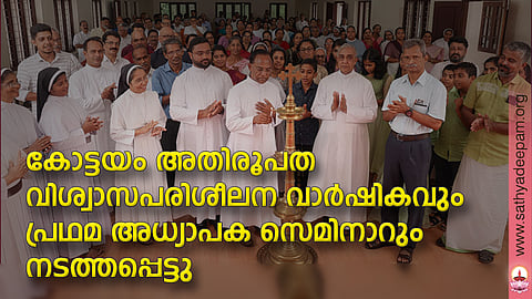 ചേര്പ്പുങ്കല്: കോട്ടയം അതിരൂപത വിശ്വാസ പരിശീലന വാര്ഷികവും പ്രഥമ അധ്യാപക സെമിനാറും സംയുക്തമായി അതിരൂപത വിശ്വാസപരിശീലന കമ്മീഷന്റെ നേതൃത്വത്തില് ചേര്പ്പുങ്കല് ഗുഡ് സമരിറ്റന് റിസോഴ്സ് സെന്ററില് വച്ച് നടത്തപ്പെട്ടു. കിടങ്ങൂര് സെന്റ് മേരീസ് ഫോറോനാ ചര്ച്ച് വികാരി ഫാ. ജോസ് നെടുങ്ങാട്ടിന്റെ അദ്ധ്യക്ഷതയില് ചേര്ന്ന യോഗം കോട്ടയം അതിരൂപത പാസ്റ്ററല് കോര്ഡിനേറ്റര് റവ. ഫാ. മാത്യു മണക്കാട് ഉദ്ഘാടനം ചെയ്തു. വിശ്വാസപരിശീലന കമ്മീഷനംഗം സി. ബെറ്റ്സി എസ്,വി.എം സ്വാഗതവും കമ്മീഷന് ചെയര്മാന് ഫാ. ജിബിന് മണലോടിയില് സമ്മാനദാനവും ജോണി ടി. കെ തെരുവത്ത് കൃതജ്ഞതയും അര്പ്പിച്ചു. വാര്ഷികാഘോഷത്തില് 10, 12 ക്ലാസ്സുകളില് വാര്ഷികപരീക്ഷയില് ഉന്നത വിജയം കരസ്ഥമാക്കിയ കുട്ടികളെയും 4, 7 ക്ലാസ്സുകളിലെ സ്കോളര്ഷിപ്പ് പരീക്ഷയില് ഉന്നതവിജയം കരസ്ഥമാക്കിയ കുട്ടികളെയും വിശ്വാസ പരിശീലന രംഗത്ത് 25 വര്ഷം പൂര്ത്തിയാക്കിയ അദ്ധ്യാപകരെയും അതിരൂപതാതലത്തില് ഉന്നതനിലവാരം പുലര്ത്തിയ സണ്ഡേസ്കൂളുകളെയും ആദരിച്ചു. വാര്ഷികത്തോടനുബന്ഡിച്ചുനടന്ന പ്രഥമ അദ്ധ്യാപകസെമിനാറിന് ബിഷപ്പ് വയലില് മെമ്മോറിയല് ഹോളി ക്രോസ് കോളേജ് അദ്ധ്യാപകന് ബ്രിസ്റ്റോ മാത്യു നേതൃത്വം നല്കി.