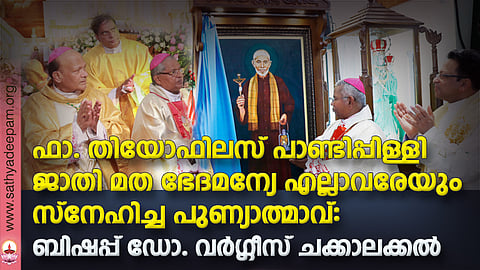പറവൂര്: ഫാ. തിയോഫിലസ് പാണ്ടിപ്പിള്ളി ജാതി മത ഭേദമന്യേ എല്ലാവരേയും സ്നേഹിച്ച, സഹായിച്ച പുണ്യാന്മാവാണെന്ന് കോഴിക്കോട് ബിഷപ്പ് ഡോ. വര്ഗ്ഗീസ് ചക്കാലക്കല് . ആരെന്നു നോക്കാതെ എല്ലാവരിലേക്കും എത്തുന്നതായിരുന്നു അദ്ദേഹത്തിന്റെ സഹായ ഹസ്തങ്ങളെന്നും ബിഷപ്പ് പറഞ്ഞു. ഫാ. പാണ്ടിപ്പിള്ളിയുടെ കബറിടം സ്ഥിതിചെയ്യുന്ന മടപ്ലാതുരുത്ത് സെന്റ് ജോര്ജ് പള്ളിയില് അദ്ദേഹത്തെ ദൈവദാസനായി പ്രഖ്യാപിച്ചു കൊണ്ടു നടന്ന ദിവ്യബലിയില് വചന പ്രഘോഷണം നടത്തുകയായിരുന്നു അദ്ദേഹം. ആഘോഷമായ പൊന്തിഫിക്കല് ദിവ്യബലിക്ക് കോട്ടപ്പുറം ബിഷപ്പ് ഡോ. ജോസഫ് കാരിക്കശ്ശേരി മുഖ്യ കാര്മികത്വം വഹിച്ചു. വരാപ്പുഴ ആര്ച്ച്ബിഷപ്പ് എമിരിത്തുസ് ഡോ. ഫ്രാന്സിസ് കല്ലറക്കല് വിശുദ്ധരുടെ നാമകരണത്തിനുള്ള തിരുസംഘത്തിന്റെ ലത്തീനിലുള്ള ബൂള വായിച്ച് ദൈവദാസ പദവി പ്രഖ്യാപനം നടത്തി . കോട്ടപ്പുറം രൂപത ചാന്സലര് റവ.ഡോ ബെന്നി വാഴക്കുട്ടത്തില് ബൂളയുടെ മലയാള പരിഭാഷ വായിച്ചു. ആര്ച്ച് ബിഷപ്പ് ഡോ. ഫ്രാന്സിസ് കല്ലറക്കല് ദൈവദാസന്റെ ഛായ ചിത്രം അനാച്ഛാദനം ചെയ്തു. നാമകരണ നടപടികളുടെ നൈയാമിക പ്രാദേശിക സഭാധികാരിയായ ബിഷപ്പ് ഡോ. കാരിക്കശ്ശേരി ദൈവദാസ പദവിയുമായി ബന്ധപ്പെട്ട ലഘുവായ വിശദീകരണ പ്രസംഗം നടത്തി. മടപ്ലാതുരുത്ത് സെന്റ് ജോര്ജ് പള്ളി വികാരി ഫാ.ജോസ് കോട്ടപ്പുറം സ്വാഗതവും കോട്ടപ്പുറം രൂപത വികാരി ജനറല് മോണ്. ഡോ. ആന്റണി കുരിശിങ്കല് നന്ദിയും അപ്പിച്ചു. കോട്ടപ്പുറം രൂപതയിലെയും വരാപ്പുഴ അതിരൂപതയിലെയും വിവിധ സന്ന്യാസ സമൂഹങ്ങളിലെയും നിരവധി വൈദീകര് സഹകാര്മികരായി . പ്രൗഢഗംഭീരമായിരുന്ന തിരുകര്മ്മങ്ങളില് നിരവധി സന്യസ്തരും വരാപ്പുഴ, കോട്ടപ്പുറം രൂപതകളില് നിന്ന് ആയിരങ്ങളും പങ്കെടുത്തു .ദിവ്യബലിക്ക് ശേഷം മടപ്ലാതുരുത്ത് സിമിത്തേരിയില് സ്ഥിതി ചെയ്യുന്ന ദൈവദാസന്റെ കബറിടത്തില് നടന്ന പ്രത്യേക പ്രാര്ത്ഥനകള്ക്ക് ബിഷപ്പ് ഡോ. വര്ഗ്ഗീസ് ചക്കാലക്കലും ബിഷപ്പ് ഡോ. ജോസഫ് കാരിക്കശ്ശേരിയും നേതൃത്വം നല്കി . മടപ്ലാതുരുത്ത് സെന്റ് ജോര്ജ് പള്ളി വികാരി ഫാ.ജോസ് കോട്ടപ്പുറം സ്വാഗതവും കോട്ടപ്പുറം രൂപത വികാരി ജനറല് മോണ്. ഡോ. ആന്റണി കരിശിങ്കല് നന്ദിയും അര്പ്പിച്ചു. ദൈവദാസനാക്കിക്കൊണ്ടുള്ള ഔദ്യോഗിക പ്രഖ്യാപനത്തോടുകൂടി ഫാ. തിയോഫിലസ് പാണ്ടിപ്പിളളിയുടെ നാമകരണ നടപടികള് ഔപചാരികമായി ആരംഭിച്ചു.