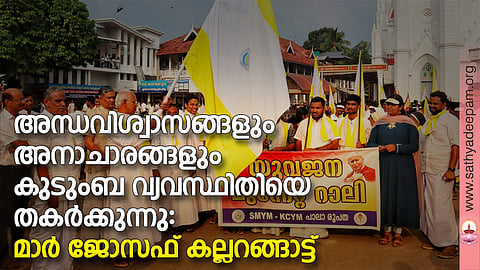 അന്ധവിശ്വാസങ്ങളും അനാചാരങ്ങളും സമൂഹത്തില് വ്യാപകമായി പെരുകുന്നു. സ്ഥാനമാനങ്ങള്ക്കും ഭൗതിക നേട്ടങ്ങള്ക്കുമായി ഏതോ ദേവപ്രീതിക്ക് മനുഷ്യന് മനുഷ്യനെ കൊല്ലുന്ന പ്രവണത സമൂഹത്തില് വര്ദ്ധിച്ചുവരുന്നു എന്നും ഇത്തരം അന്ധവിശ്വാസങ്ങള് അനാചാരങ്ങളും കുടുംബഭദ്രതയെ തകര്ക്കുന്നു എന്നും പാലാ രൂപതാധ്യക്ഷന് മാര് ജോസഫ് കല്ലറങ്ങാട്ട്.എസ്. എം. വൈ. എം. പാലാ രൂപതയുടെ നേതൃത്വത്തില് നടത്തിയ പൊതുസമ്മേളനം ഉദ്ഘാടനം ചെയ്ത് സന്ദേശം നല്കുകയായിരുന്നു പിതാവ്. ഒപ്പം നല്ല രാഷ്ട്രീയ ചിന്തകള് യുവജനങ്ങള് വളര്ത്തുന്നത് ജനാധിപത്യത്തെ വളര്ത്തുവാന് സഹായിക്കുന്നു എന്നും സന്ദേശത്തില് കൂട്ടിച്ചേര്ത്തു. ലഹരി,സദാചാര ഗുണ്ടായിസം, ലിംഗസമത്വം, അബോര്ഷനെതിരെ, കുട്ടികള്ക്കെതിരെ വര്ദ്ധിച്ചുവരുന്ന അതിക്രമത്തിനെതിരെ, കൃഷി നാശം ,ബഫര് സോണ് , ദളിത് ക്രൈസ്തവരുടെ അവകാശങ്ങള് തുടങ്ങിയ വിഷയങ്ങള് സമീപകാലത്ത് നടന്ന സംഭവങ്ങള് ഉദാഹരണം സഹിതം പിതാവ് സന്ദേശത്തില് പ്രതിപാദിച്ചു.