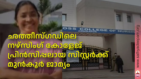 വ്യാജമായ മതപരിവര്ത്തനാരോപണം ഉന്നയിച്ചു കേസില് കുരുക്കാനുള്ള ശ്രമത്തിനു വിധേയയായിക്കൊണ്ടിരിക്കുന്ന ഛത്തീസ്ഗഡിലെ നഴ്സിംഗ് കോളേജ് പ്രിന്സിപ്പല് സിസ്റ്റര് ബിന്സി ജോസഫിനു ബിലാസ്പൂര് ഹൈക്കോടതി മുന്കൂര് ജാമ്യം നല്കി.