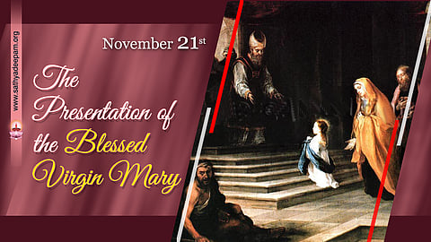 ഭക്തരായ യഹൂദമാതാപിതാക്കള് തങ്ങളുടെ കുട്ടികളെ ദൈവത്തിനു കാഴ്ചവയ്ക്കുന്ന ഒരു പതിവുണ്ടായിരുന്നു. അങ്ങനെയാണ് യോവാക്കിമും അന്നയും തങ്ങളുടെ മകള് മറിയത്തെ മൂന്നു വയസ്സുള്ളപ്പോള് നസറത്തുനിന്ന് 80 മൈല് അകലെയുള്ള ജറൂസലത്തുകൊണ്ടുപോയി ദേവാലയത്തില് കാഴ്ചവച്ചത്. അവിടെ വിശുദ്ധരായ സ്ത്രീകളുടെ ശിക്ഷണത്തില് മറ്റു കന്യകകളായ കുട്ടികളുടെ കൂടെ ദൈവത്തിന്റെ ദാസിയായി അവള് വളരുകയായിരുന്നു. മറിയത്തെ ദൈവാലയത്തില് കാഴ്ചവച്ച തിരുനാള് ഇന്നു നമ്മള് ആഘോഷിക്കുന്നു.